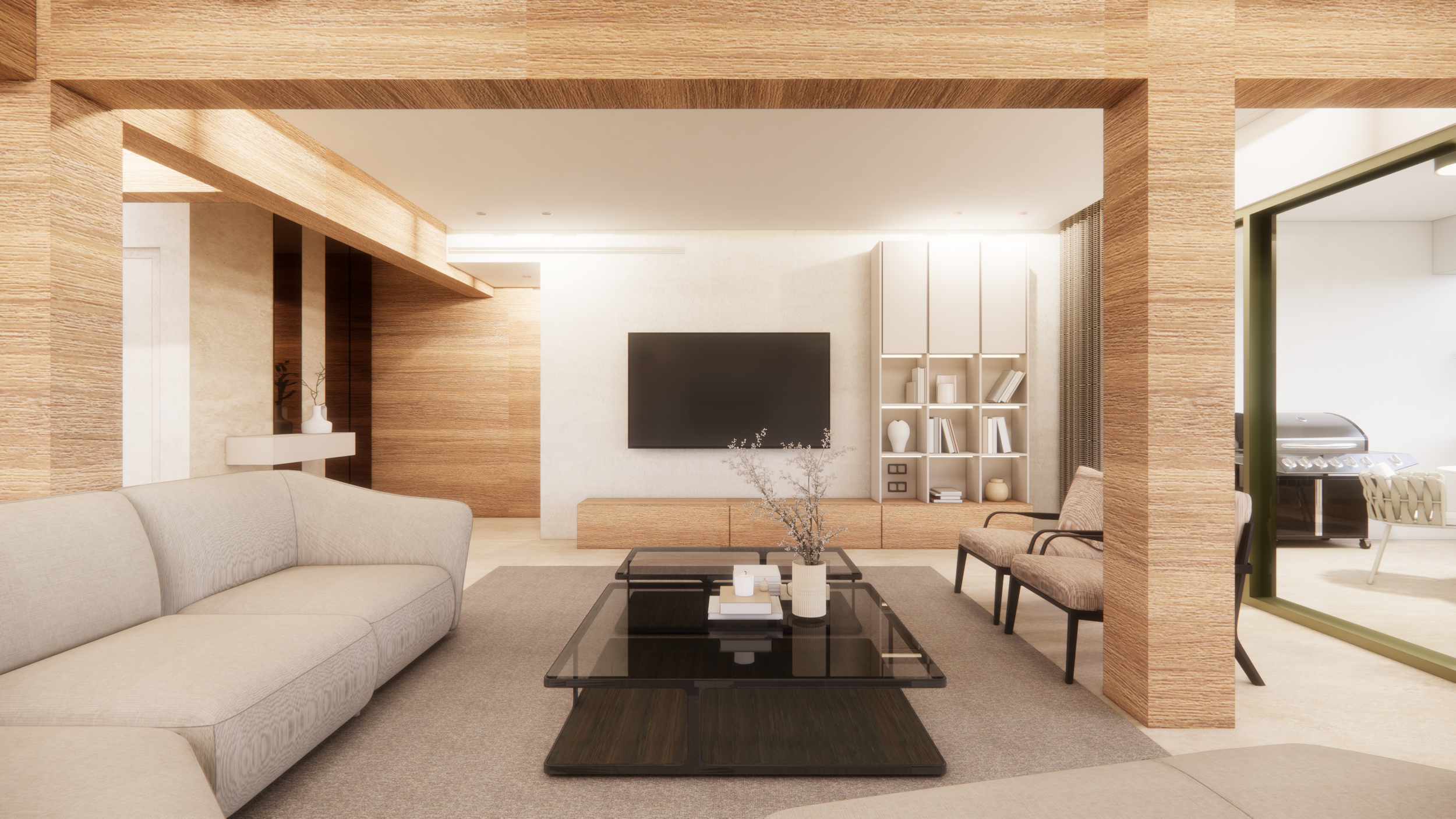 Existing structural columns were embraced as a feature, clad in wood to evoke a pavilion-like rhythm that defines the open–plan layout.