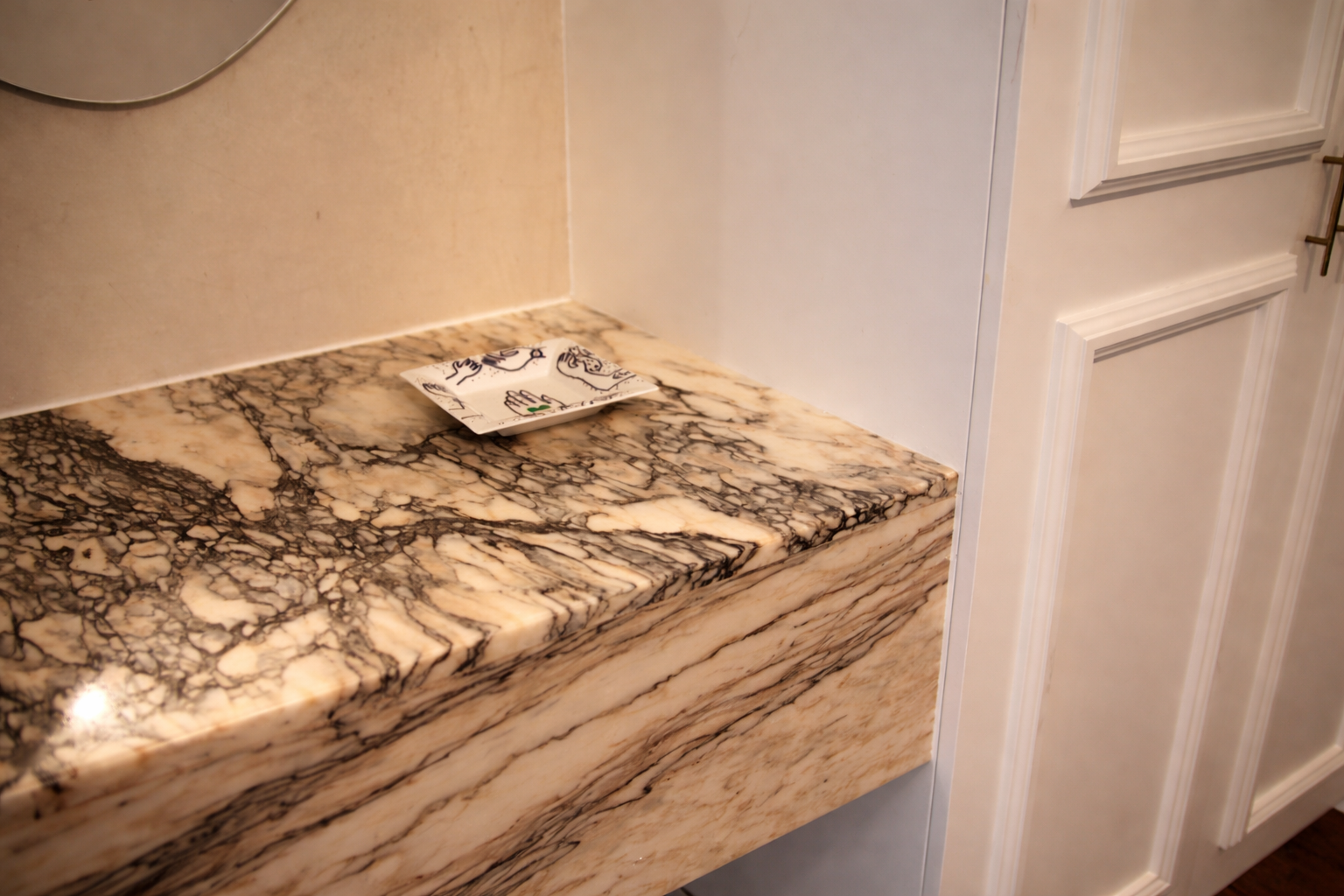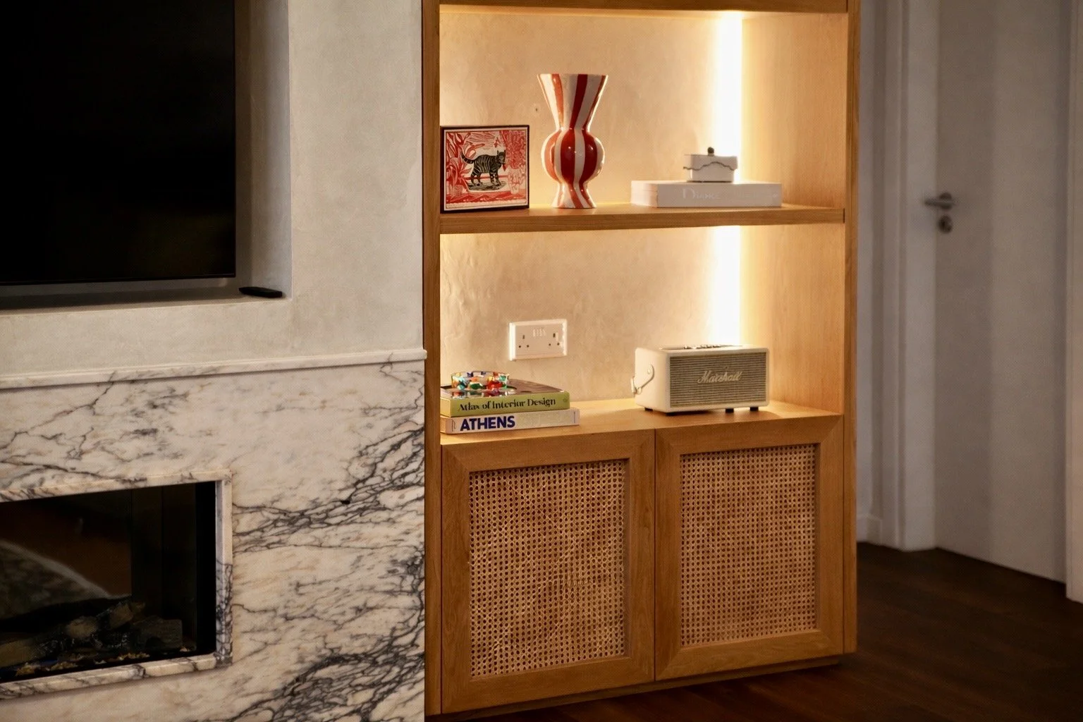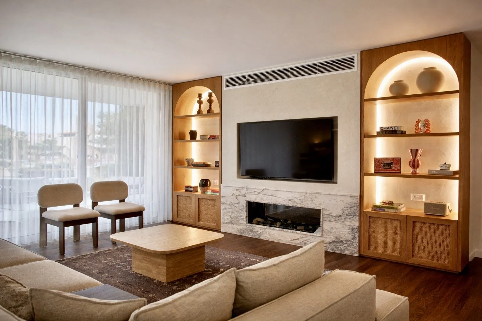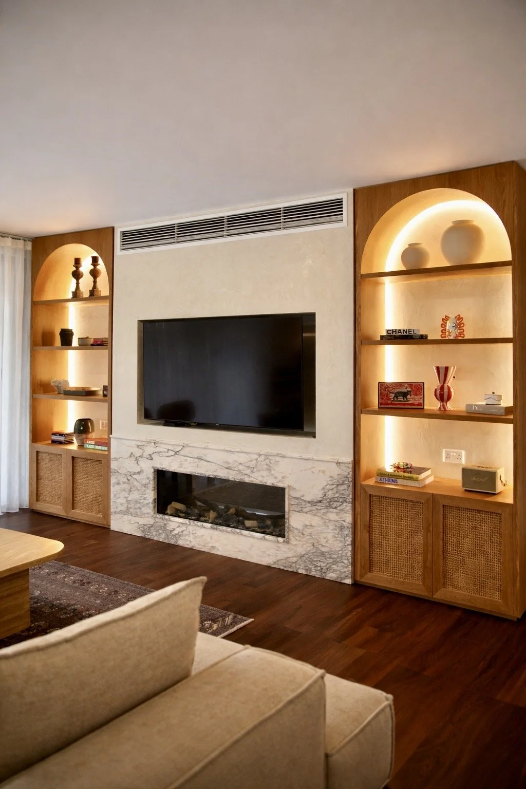 A sculptural Calacatta Viola marble fireplace anchors the living area, its dramatic veining adding richness and contrast. Custom arched bookcases with integrated atmospheric lighting create rhythm along the walls, balancing classic form with modern warmth.