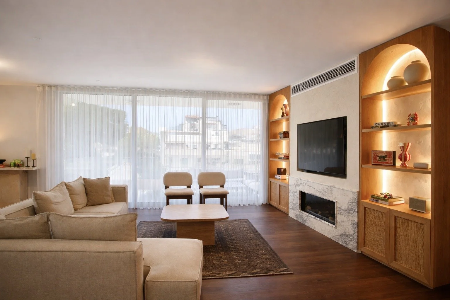 This 180 m² apartment reinterprets classic French interiors through a contemporary lens. Elegant plaster cornices define the spaces, lending architectural depth and timeless refinement.