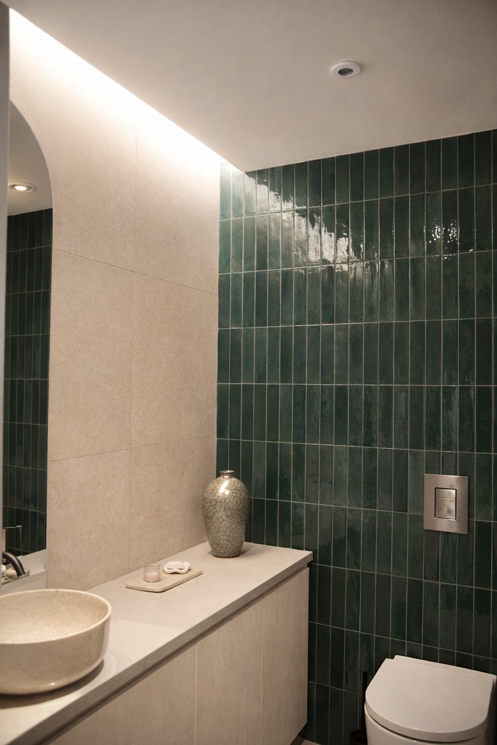 The bathroom introduces a darker, more intimate mood, finished in deep dark green tiles that bring a sense of quiet drama and sophistication.