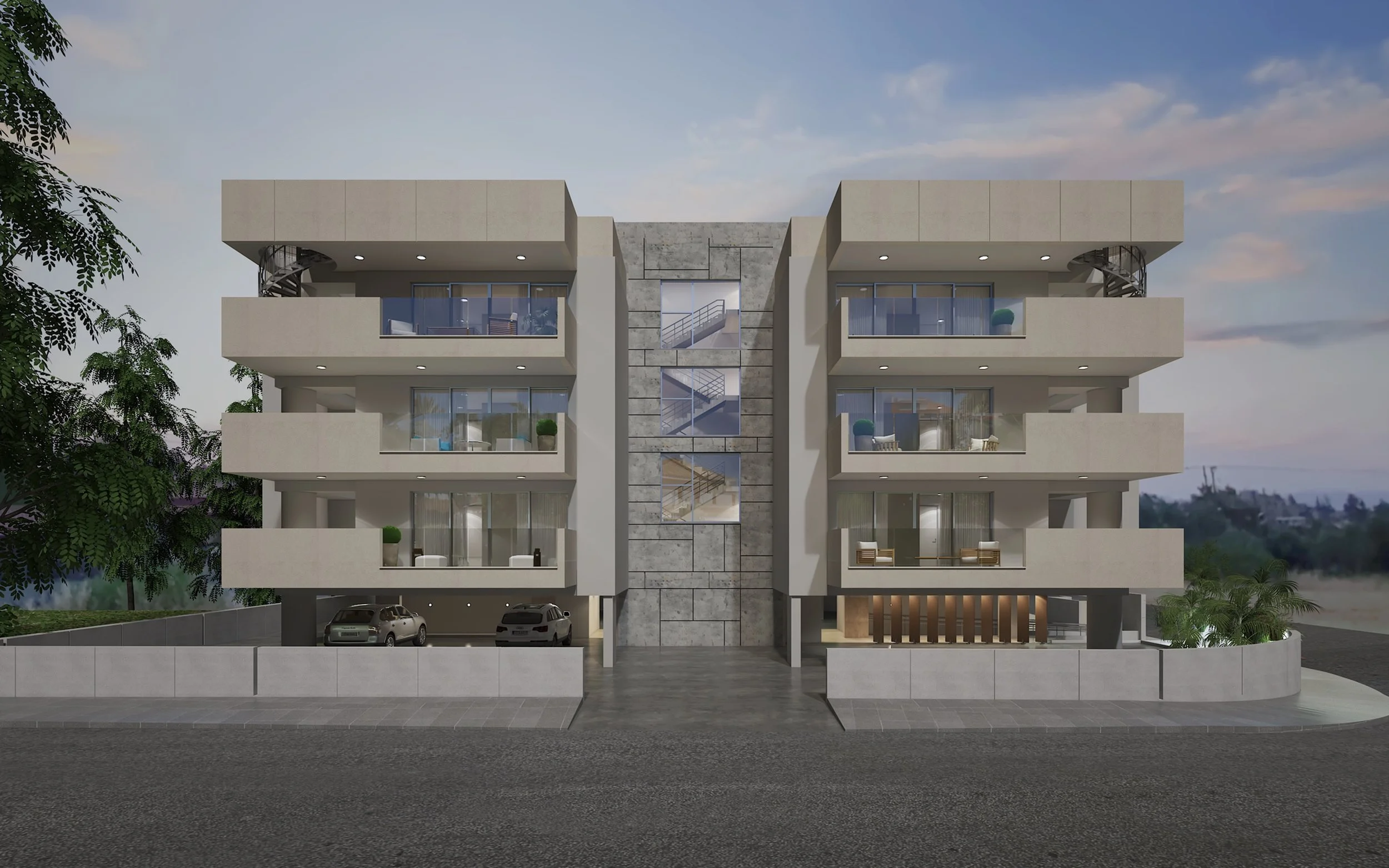 Kykladon Apartments in Aglantzia is a contemporary residential development featuring 12 one-bedroom and 6 two-bedroom apartments, designed with a minimalist aesthetic and an emphasis on serenity. The building’s clean concrete and plaster exterior conceals bright, airy interiors with excellent ceiling heights and open-plan layouts, complemented by large private balconies and shared rooftop terraces.